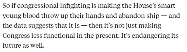 正如美国广播公司所说,如果国会内斗正在使众议院中聪明能干的年轻议员们“弃船而去”,那么它不仅会使美国国会在目前愈加缺乏运行能力,也会危及它的未来。