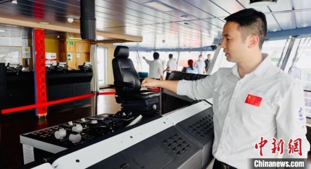 “雪龙2”号见习船长伍安超向记者介绍驾驶室的智能化设备。中新社记者 戴小橦摄