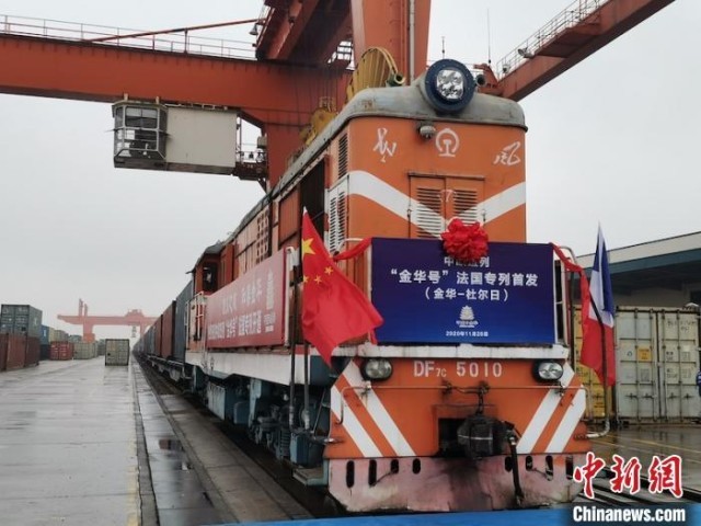 资料图:“金华号”法国专列从铁路金华南货运站鸣笛启程。 马锦标 摄
