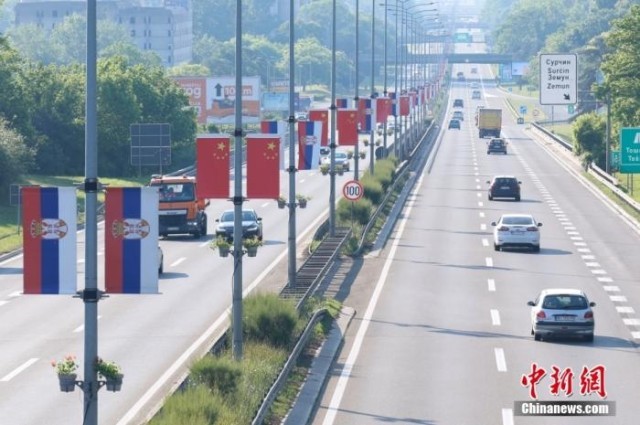 当地时间5月6日,塞尔维亚首都贝尔格莱德,五星红旗和塞尔维亚国旗在城市主要道路上沿街排列。中新社记者 韩海丹 摄
