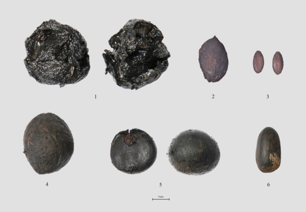 出土植物遗存(1.李; 2.李核; 3.甜瓜子; 4.梅核; 5.栗子; 6.莲子)