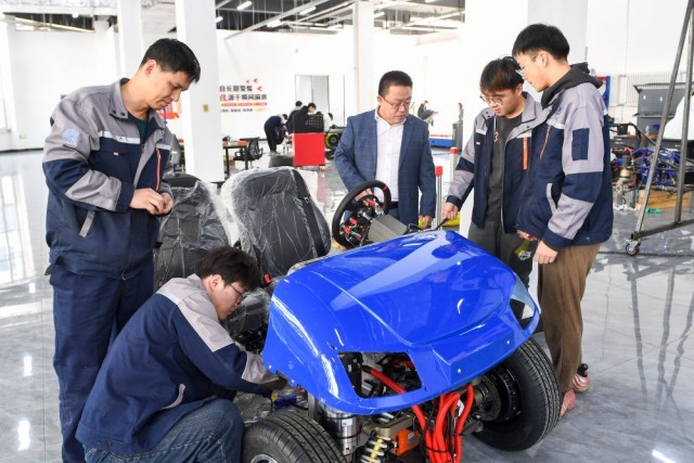 2024年3月13日,长春市麦迪克智行汽车科技有限公司,吉林大学汽车工程学院教授靳立强(右三)与同事检查智能底盘样车。新华社记者 张楠 摄