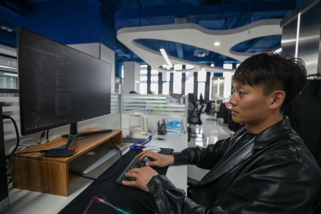 2024年4月18日,在哈尔滨工业大学人工智能研究院有限公司,科研人员在进行数据编程。新华社记者 张涛 摄