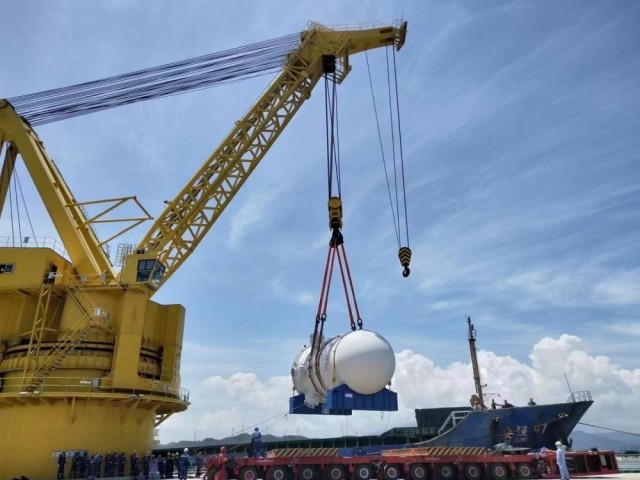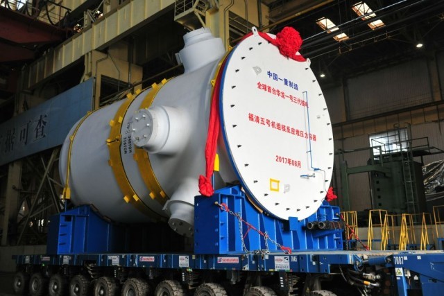 2017年8月,全球首台“华龙一号”三代核电——福清五号机组反应堆压力容器准备进行吊装(资料照片)。