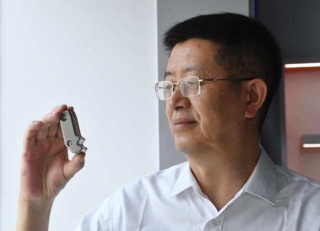 5月24日,在位于成都的中国核动力研究设计院内,钟元章在展示通过3D打印的堆内构件堆芯围筒。钟元章介绍,通过3D打印的方式来生产“华龙一号”的零部件,是目前的一个研究方向。