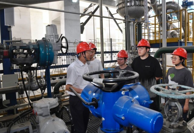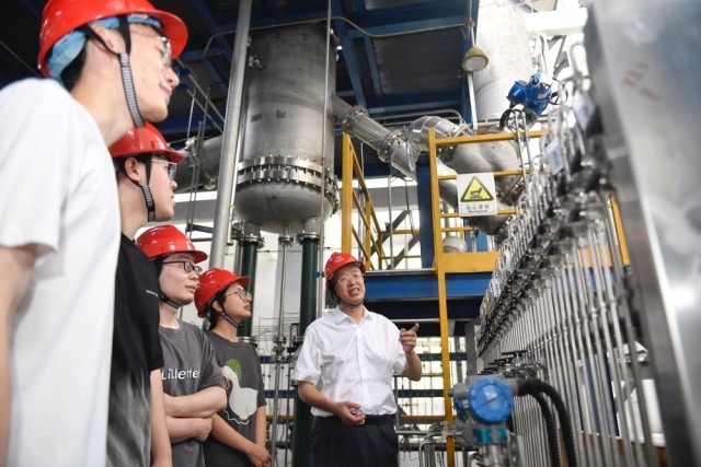 5月24日,在位于成都的中国核动力研究设计院内,钟元章(右一)与团队年轻人在试验台架上交流。