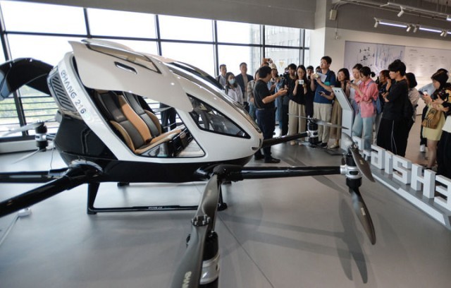 在亿航智能设备(广州)有限公司展厅,工作人员为媒体记者介绍EH216-S载人级无人驾驶飞行器(2024年5月14日摄)。