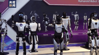 总台央视记者 张丛婧:在世界人工智能大会的机器人阵列展区,首次集中亮相了18款代表着国内最先进水平的人形机器人。它们形态各异,大小不一,这些机器人们正在跟观众朋友们打招呼。