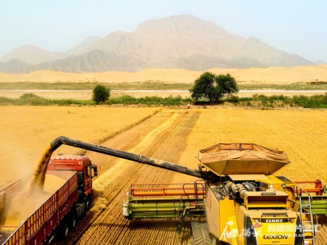 6月28日,联合收割机在地处塔克拉玛干沙漠边缘的新疆生产建设兵团第三师49团3连麦田里收割小麦。6月下旬,南疆广大地区小麦陆续成熟,人们抢抓农时抢收小麦,确保丰产丰收。王志清摄