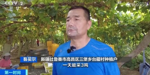 新疆吐鲁番市高昌区三堡乡台藏村种植户 吾买尔:我家有18亩葡萄地,一天能采摘3吨,可以卖2万元。