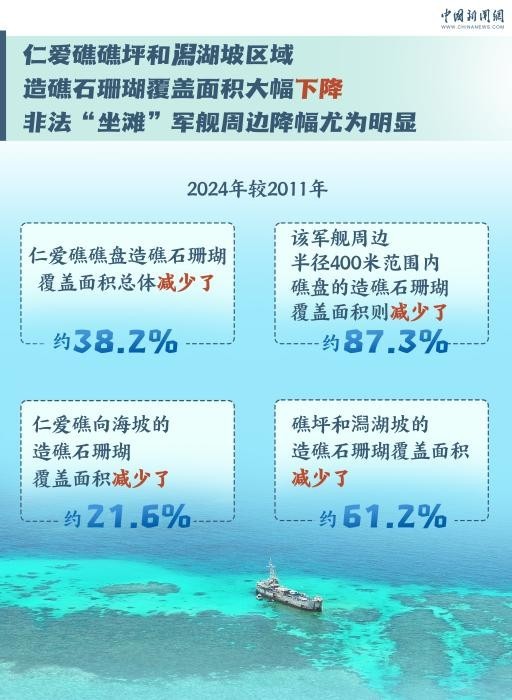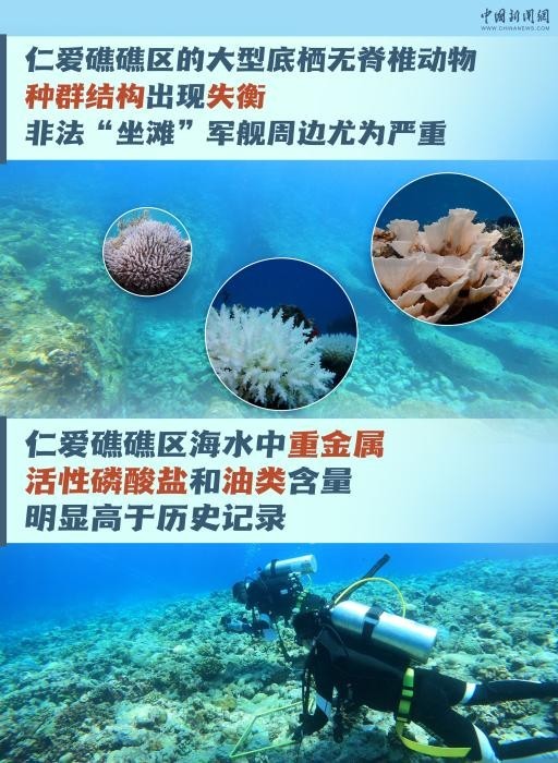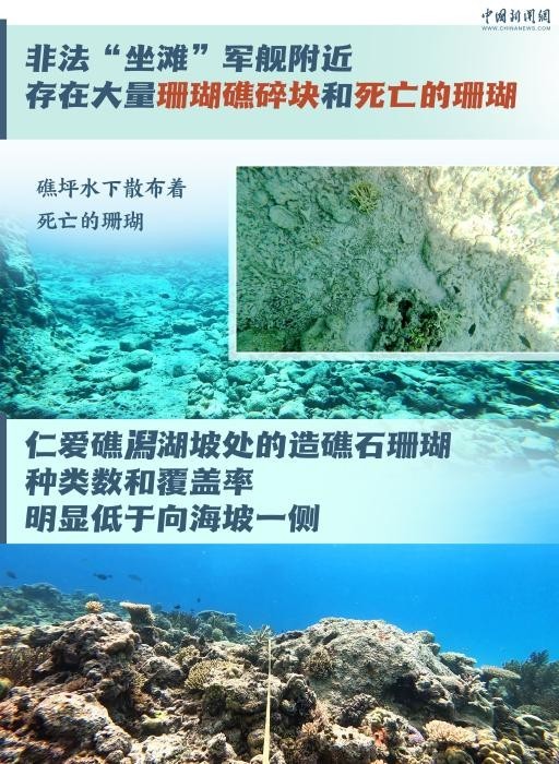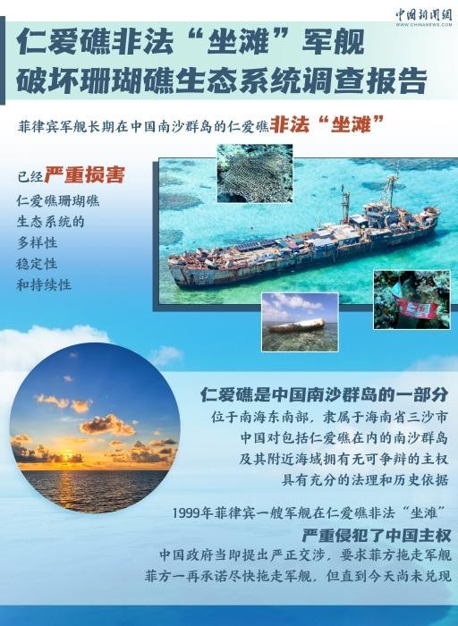 两天前,由自然资源部南海生态中心和自然资源部南海发展研究院共同编制的《仁爱礁非法“坐滩”军舰破坏珊瑚礁生态系统调查报告》发布。这份《报告》指出,菲律宾军舰长期在中国南沙群岛的仁爱礁非法“坐滩”,已经严重损害仁爱礁珊瑚礁生态系统的多样性、稳定性和持续性。