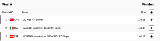 本届赛会,刘浩/季博文在预赛中就以1分37秒40的成绩晋级半决赛,还创造了该项目的奥运最好成绩,此后,他们又以小组第一从半决赛晋级。今天的决赛中,他们全程领先,以绝对优势站上奥运最高领奖台。