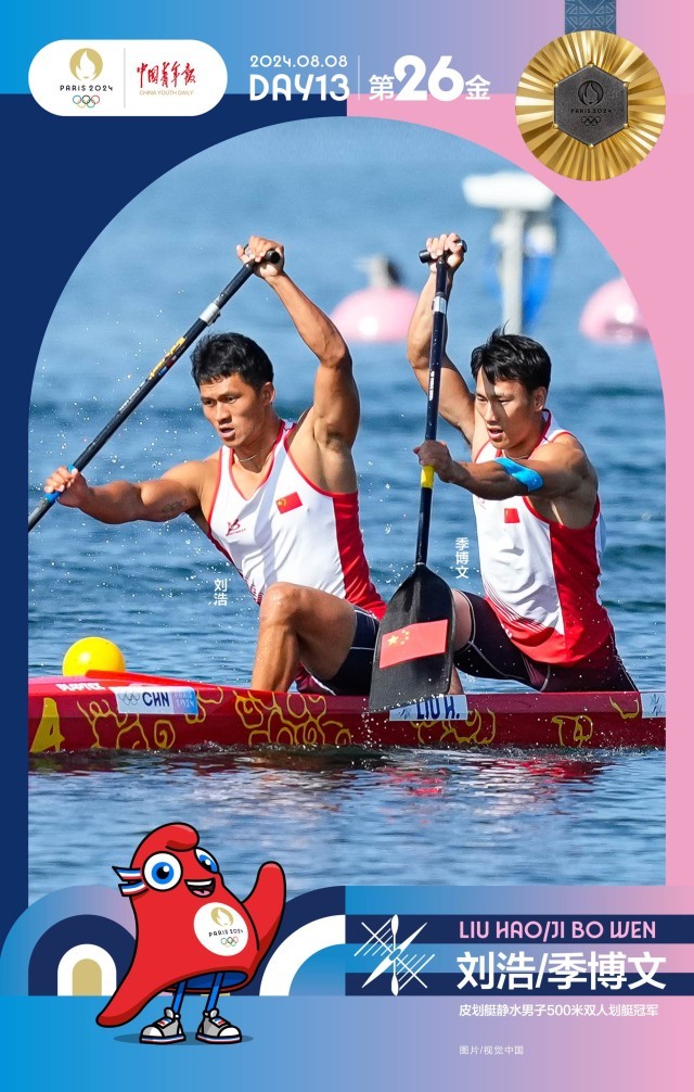 中国青年报客户端巴黎8月8日电(中青报·中青网记者 梁璇)当地时间8月8日,巴黎奥运会男子500米双人划艇决赛中,中国组合刘浩/季博文以绝对优势夺得冠军。