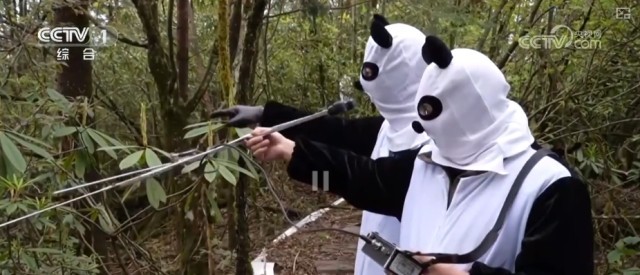 在复壮野生大熊猫种群的过程中,野化放归是一大重要手段。在中国大熊猫保护研究中心卧龙核桃坪基地里,工作人员身着熊猫伪装服,对大熊猫进行野化训练。