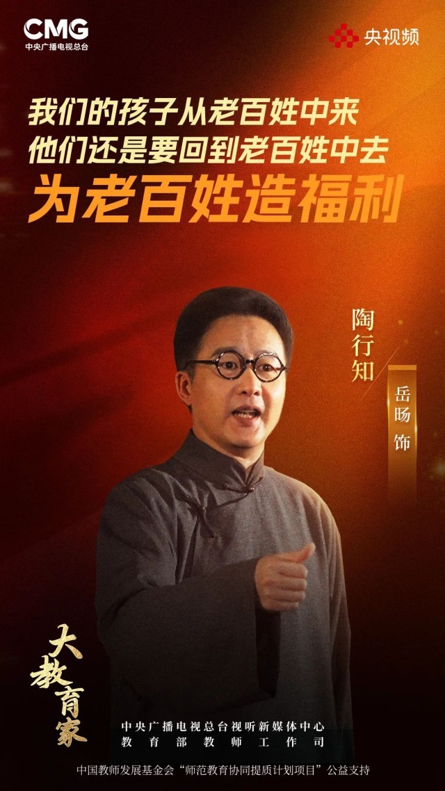 在历史的长河中,一个个教育先驱,如同璀璨的星辰,照亮了人类文明的天空,引领着教育的航船,启迪着一代代学子的心灵。8月27日,由中央广播电视总台视听新媒体中心、教育部教师工作司联合制作,中国教师发展基金会“师范教育协同提质计划项目”公益支持的系列节目《大教育家》之《陶行知》将在央视频APP上线。本期节目,我们将跟随演员岳旸,一同感悟陶行知先生的育人智慧,回顾他为中国教育事业作出的卓越贡献。