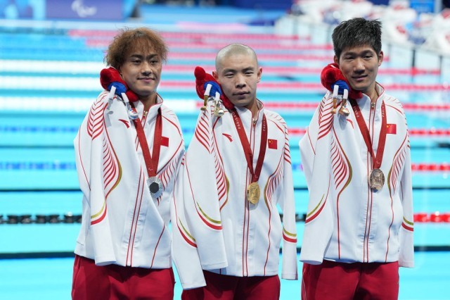 新华社巴黎9月6日电(记者马思嘉、张薇)6日晚,巴黎拉德芳斯体育馆,全场观众起立,注视着三面五星红旗伴着雄壮的《义勇军进行曲》冉冉升起——在巴黎残奥会男子50米蝶泳S5级决赛中,中国选手郭金城、袁伟译、王李超包揽金银铜牌。