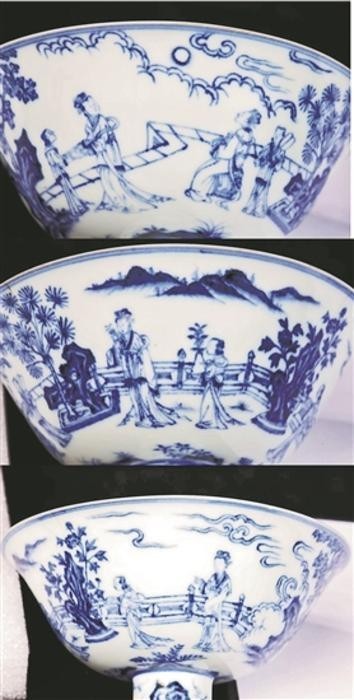 图③:明青花瑶台赏月图瓷锺三组人物图像。湖北省博物馆供图