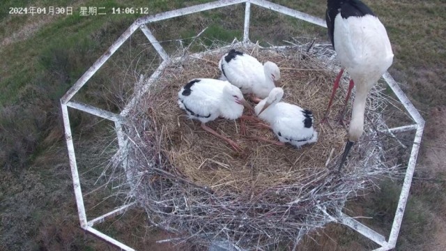 这是生态监测中心实时监测的东方白鹳育雏画面。(山东黄河三角洲国家级自然保护区供图)