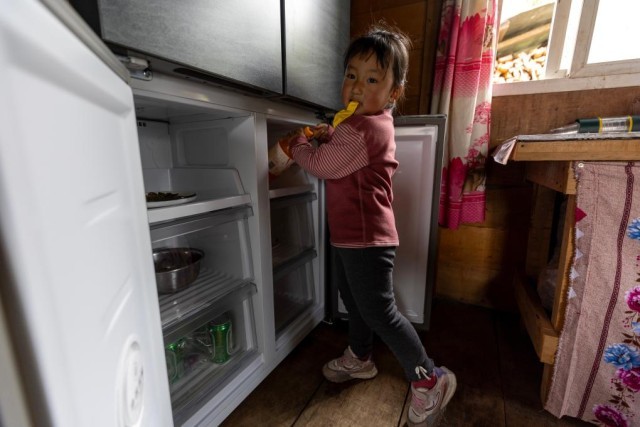 墨脱县达木珞巴民族乡达木村4岁的小朋友次仁拉姆从自家冰箱中取出饮料待客(4月25日摄)。新华社记者 姜帆 摄