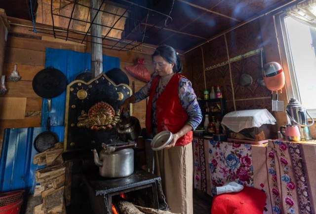 达木村村民桑杰措姆在家中烧茶。据她介绍,这火炉是公路通车前家里人走山路从100多公里外背回来的,非常具有纪念意义(4月25日摄)。新华社记者 姜帆 摄