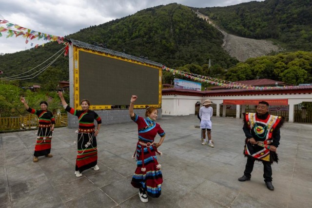 索朗(右一)在村里的广场上指导年轻一代跳“刀舞”(4月25日摄)。新华社记者 姜帆 摄