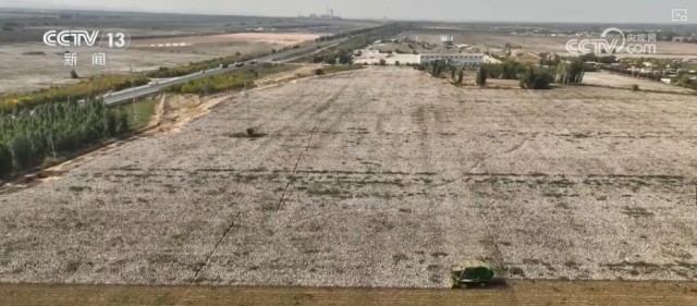 在昌吉州玛纳斯县乐土驿镇的万亩棉田里,新引进的棉花采收打包一体机正在棉田里穿梭。