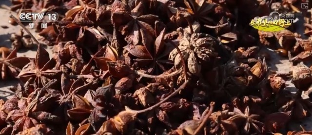 八角一年可采摘两次,分别是每年立春后和立秋后。在百色市田林县,村民们将采收的八角运送到 当地农副产品经营部进行统一加工销售。在当地的八角加工基地,成片的八角铺满晒坪,工人们不时用工具进行翻晾,使其受热均匀,提升八角的品质。