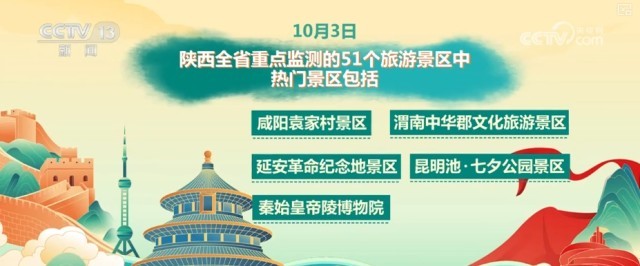 10月3日,陕西全省重点监测的51个旅游景区中,热门景区有咸阳袁家村景区、渭南中华郡文化旅游景区、延安革命纪念地景区、昆明池七·夕公园景区、秦始皇帝陵博物院。