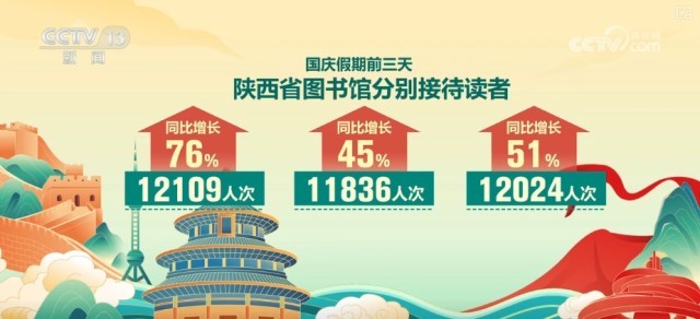 在假期,寻觅书香是不少人的选择。假期前三天,陕西省图书馆分别接待读者12109人次、11836人次和12024人次,同比分别增长76%、45%和51%。