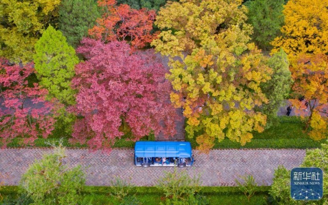 10月19日拍摄的南京明孝陵景区石象路秋景(无人机照片)。