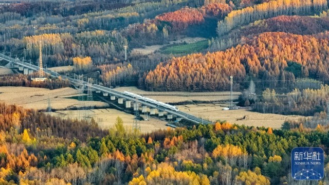 10月13日,一辆列车穿行在黑龙江省尚志市的森林田野间(无人机照片)。