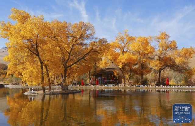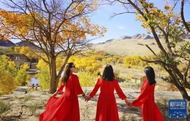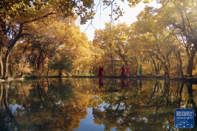 10月13日,游客在甘肃省敦煌市莫高镇的胡杨林间游玩。