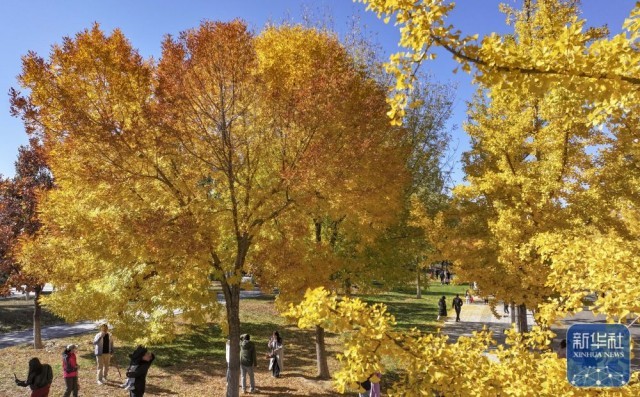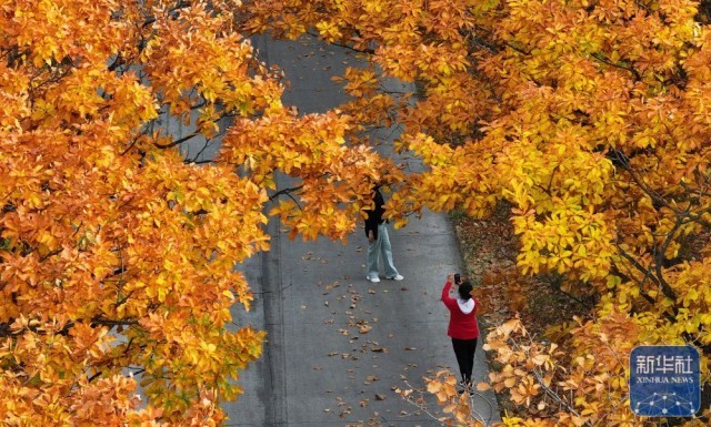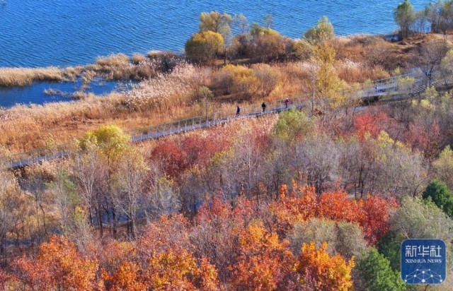 10月19日,人们在河北省张家口市明湖区域的滨河公园赏景拍照(无人机照片)。