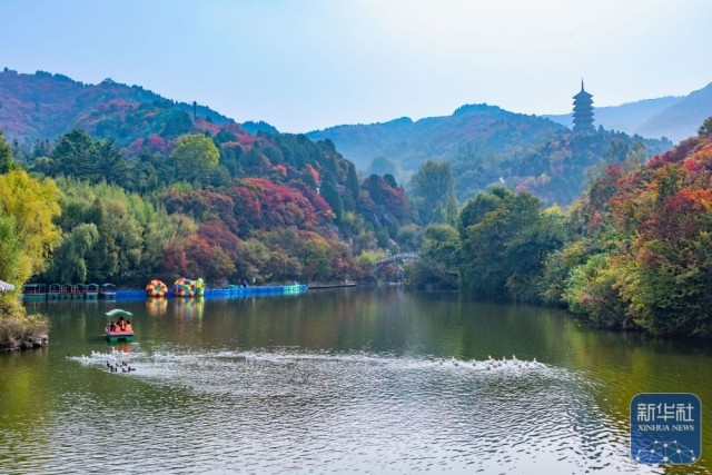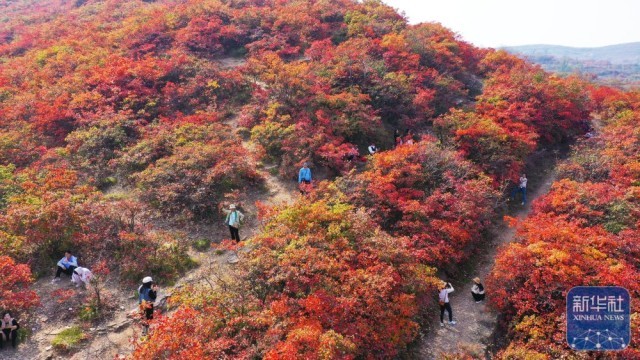 10月15日,游客在山东济南红叶谷景区游玩。