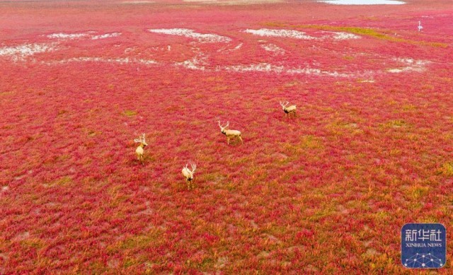 10月16日,在江苏东台条子泥湿地,麋鹿在盐蒿地栖息(无人机照片)。