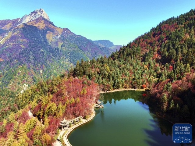 10月15日拍摄的甘肃省陇南市宕昌县官鹅沟国家森林公园秋景(无人机照片)。