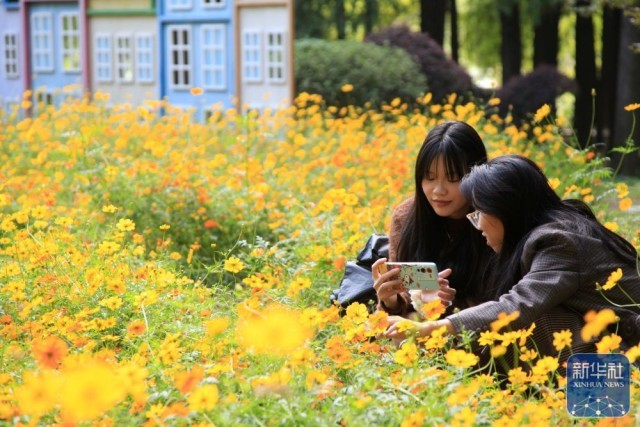10月20日,游人在南京中山植物园盛开的黄秋英花丛中赏花拍照。