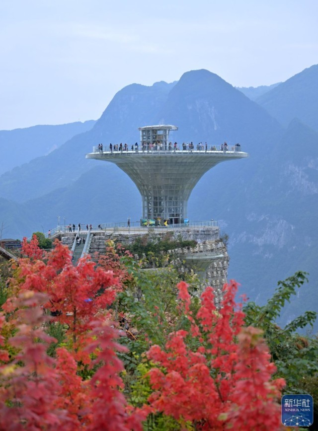 10月16日,游客在湖北省恩施土家族苗族自治州巴东县境内的长江巫峡口景区欣赏秋景。
