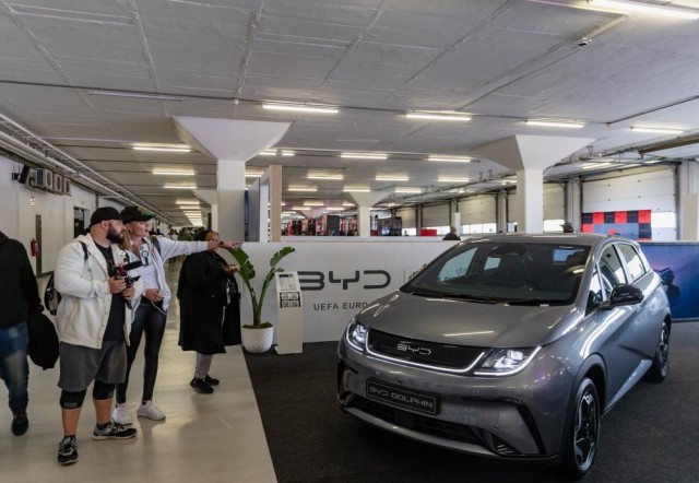 8月30日,在南非约翰内斯堡汽车节上,参观者在比亚迪展厅参观新能源车。新华社记者张誉东摄