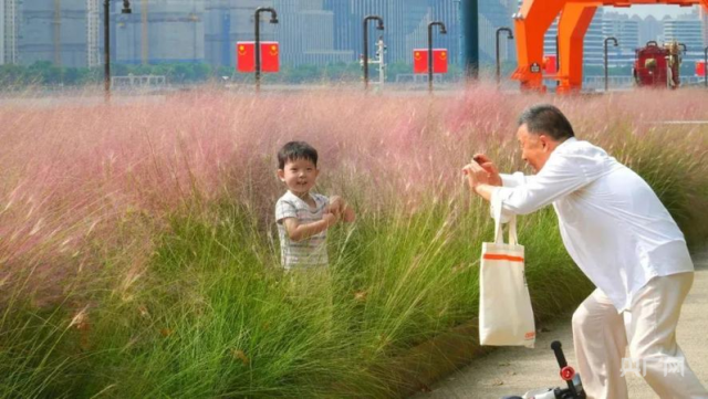 杨浦滨江秀带广场附近的大片粉黛乱子草吸引市民驻足拍照(央广网发 杨浦区新闻办供图)