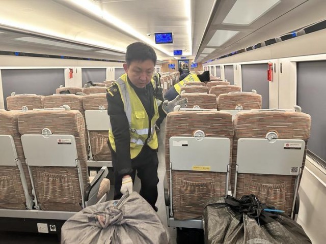 中铁快运工作人员在高铁上搬运快递。(受访者供图)