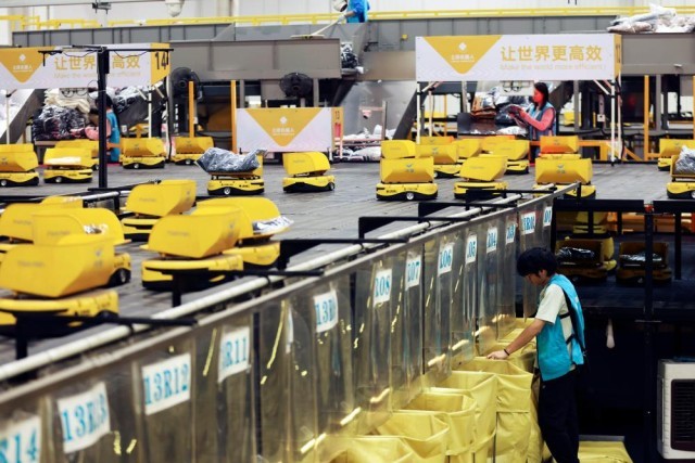 11月7日,浙江省湖州市德清县乾元镇第一产业智慧物流园区快鱼服饰有限公司华东物流中心,工人在封包分拣“小黄人”机器人配送的服饰。新华社发(倪立芳摄)