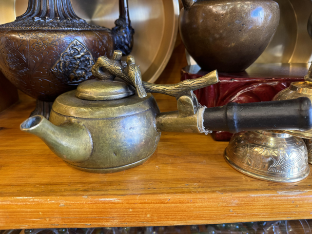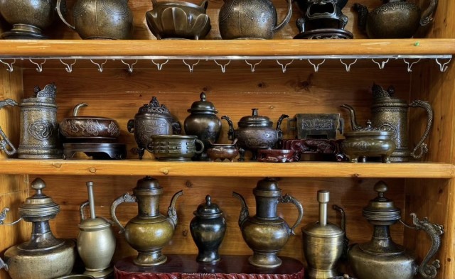 工艺品商户:这是茶壶,搭在火炉上面边烫边喝的,是纯手工做的,属于藏文化……