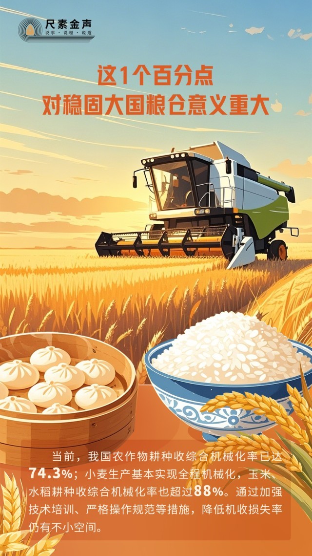 就整个粮食生产链条来看,收获是其中重要一环。随着农业科技的不断进步,我国粮食生产的机械化程度不断提高。总体看,当前我国农作物耕种收综合机械化率已达74.3%;分品种看,小麦生产基本实现全程机械化,玉米、水稻耕种收综合机械化率也超过88%。在这个机械化水平上,通过加强技术培训、严格操作规范等措施,降低机收损失率仍有不小空间。