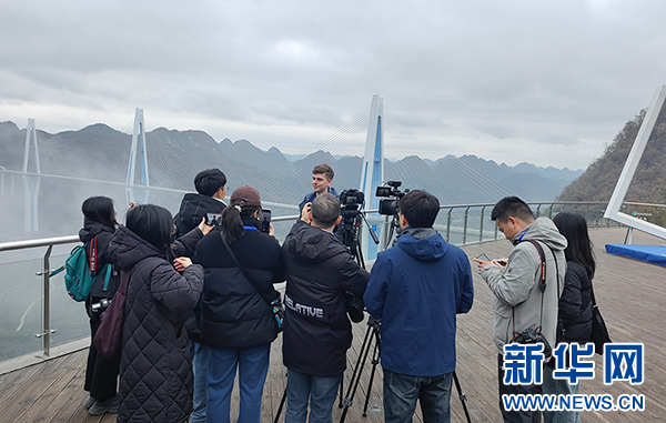 媒体记者在“天空之桥”景区采访。新华网发