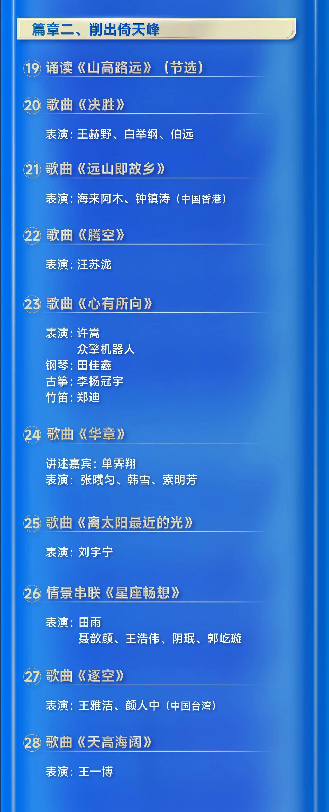 《启航2025》跨年晚会突出思想性和艺术性的融合,以“山河锦绣,国泰民安”为主题,在山东泰安设置主会场。晚会在感怀过去一年难忘的历程中,憧憬着更加灿烂的新一年的到来。节目以山为媒,从万里长城出发联动巍峨五岳,通过经典诗文诵读串联“直下看山河”“会当凌绝顶”“削出倚天峰”“峰前回雁时”“云中天下脊”“立乎天地中”等篇章,借助高山的坚韧之质,尽展中华民族自强不息的精神。
