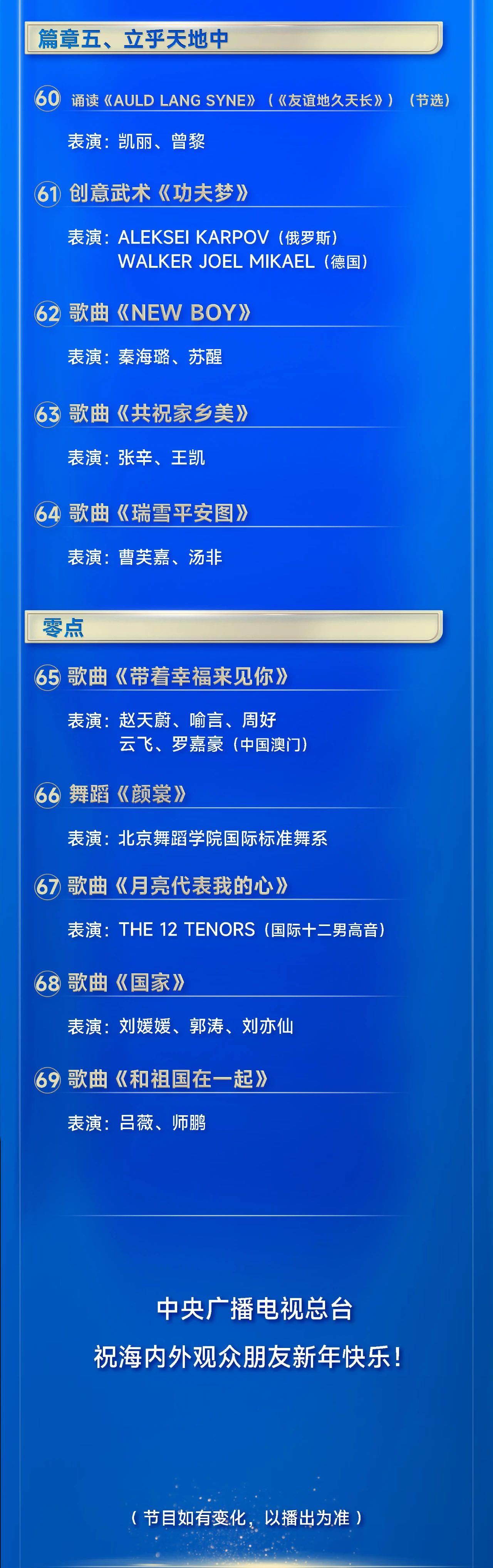 岁序更替,璀璨启航!《启航2025——中央广播电视总台跨年晚会》将于今天20:00档,在央视综合频道(CCTV-1)、综艺频道(CCTV-3)、音乐频道(CCTV-15),央视新闻、央视频、央视网、云听客户端,以及音乐之声、经典音乐广播、文艺之声等平台与广大受众见面。