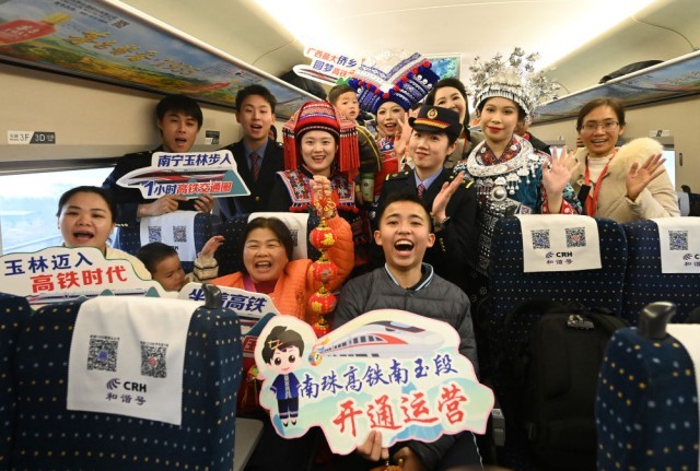 2024年12月30日,工作人员和乘客在广西玉林开往南宁的列车上合影。