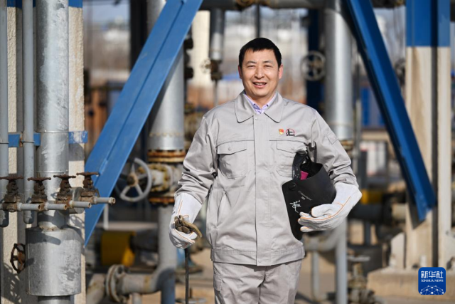 在中石化第四建设有限公司工匠学院,张振连查看焊口(2025年1月10日摄)。