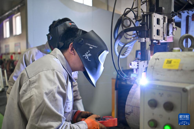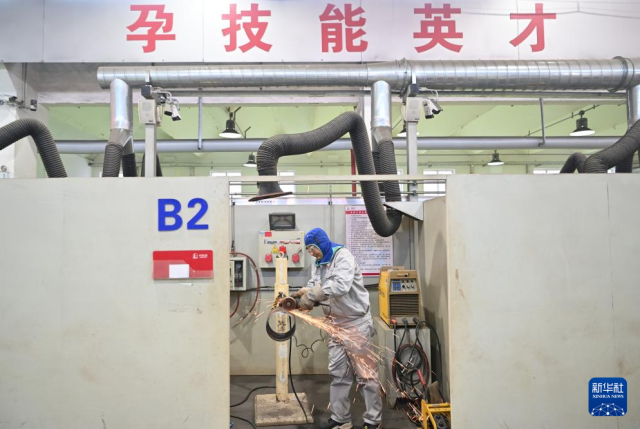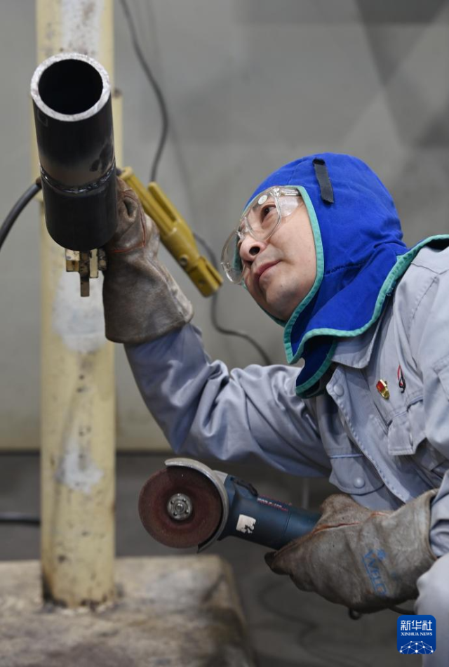 在中石化第四建设有限公司工匠学院,张振连打磨焊口(2025年1月10日摄)。